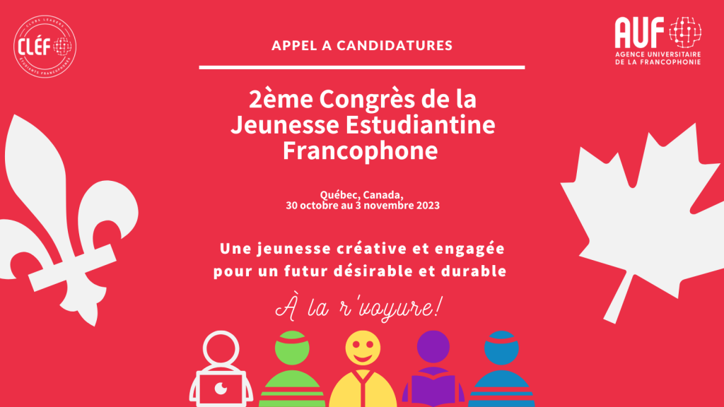 L’AUF lance un appel à candidatures au sein du réseau CLÉF afin de sélectionner 60 clubs étudiants qui participeront au prochain Congrès de la Jeunesse Estudiantine Francophone dans le cadre de la 3ème Semaine Mondiale de la Francophonie Scientifique qui se tiendra du 30 octobre au 3 novembre 2023 à Québec (Canada).