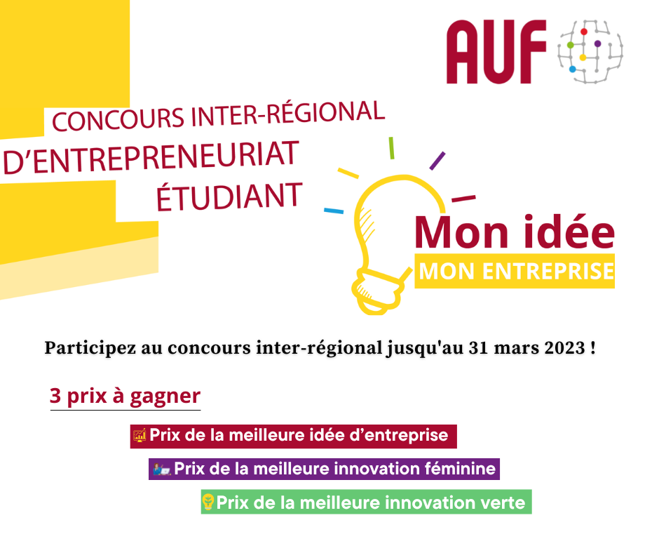 Dans le but de promouvoir et de susciter l’esprit d’entrepreneuriat en milieu universitaire, les Directions régionales Afrique australe et Océan indien, Afrique centrale et Grands Lacs, et Afrique de l’Ouest de l’AUF s’associent pour organiser la 2ème édition du concours inter-régional « Mon idée, Mon entreprise ». Le concours s’adresse aux étudiants des établissements membres de l’AUF et vise fondamentalement à leur offrir l’opportunité et les moyens de transformer leurs idées en projet d’entreprise.