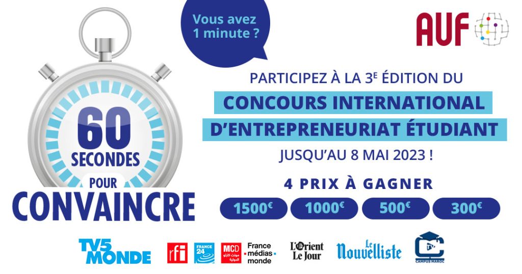 Le concours international pour jeunes entrepreneur·e·s « 60 secondes pour convaincre » est organisé par l’Agence Universitaire de la Francophonie (AUF) en partenariat avec TV5MONDE, France Médias Monde (RFI, France 24, Monte Carlo Doualiya), L’Orient-Le Jour (Liban), Le Nouvelliste (Haïti) et Campus Maroc TV.