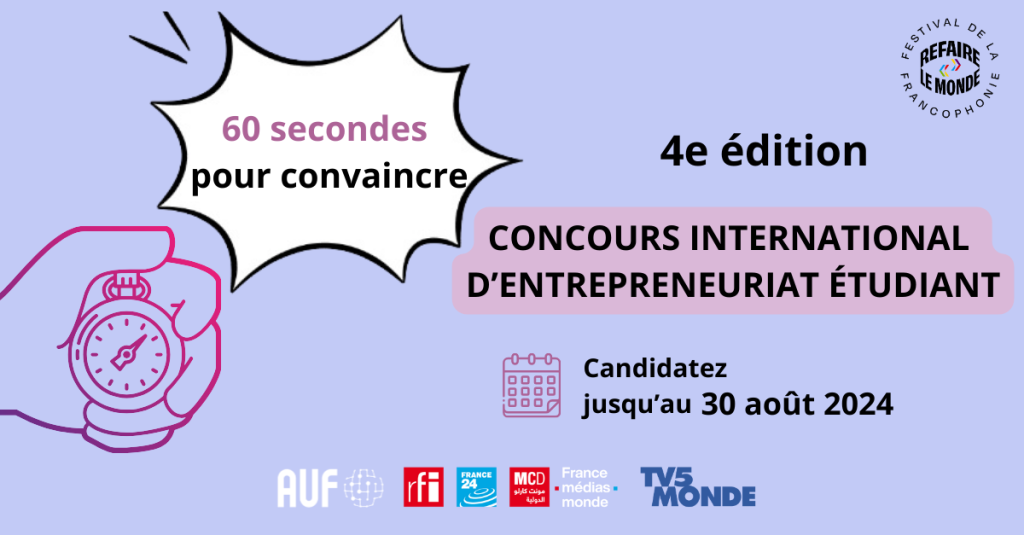 Le concours international d’entrepreneuriat étudiant « 60 secondes pour convaincre » est organisé par l’Agence Universitaire de la Francophonie (AUF) en partenariat avec France Médias Monde (RFI, France 24, Monte Carlo Doualiya) et TV5MONDE.