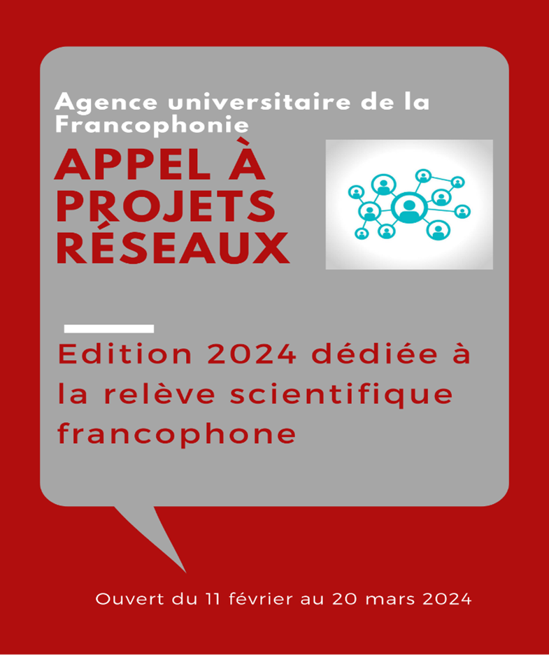 L’AUF dédie l’appel à projets 2024 à la promotion et au soutien de la relève scientifique. Le but étant de faire découvrir, d’encourager et de développer les talents émergents dans les divers domaines scientifiques, et de contribuer au renouvellement de la recherche à l’échelle nationale et internationale. Les projets déposés devront par conséquent mettre en évidence l’implication des jeunes chercheurs, doctorants, étudiants dans la réalisation de projets innovants, à impact social ou environnemental.